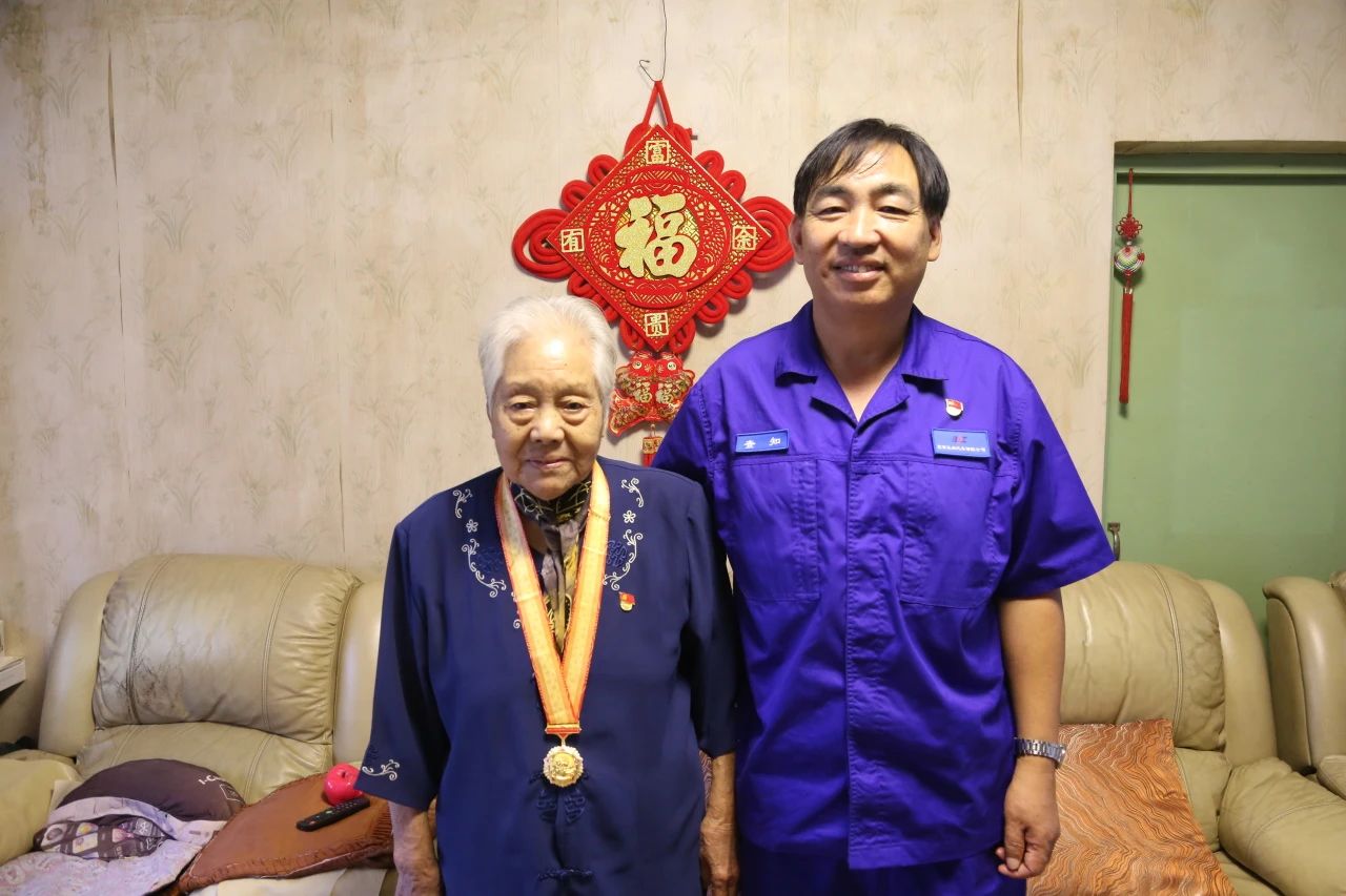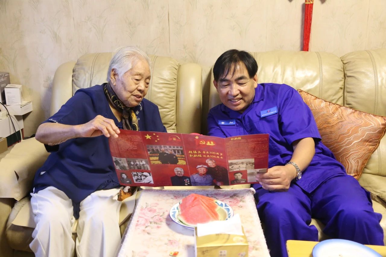 在趙福玉家中,查知親手將紀(jì)念章送到老干部手中,并和老人促膝交談,詳細(xì)詢問她的生活起居和身體狀況,認(rèn)真傾聽老同志回憶烽火歲月的經(jīng)歷,以及對公司發(fā)展歷程的感悟,對如今幸福生活的感想。